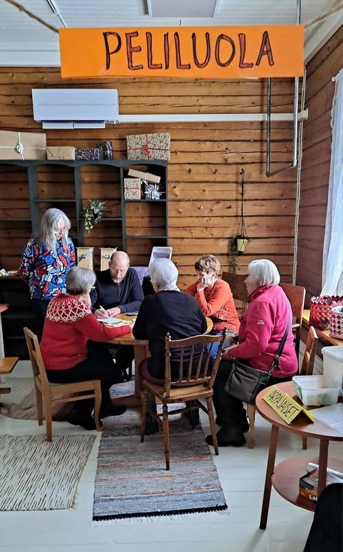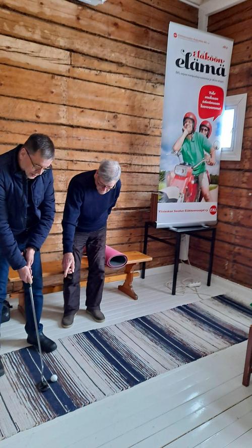 Kasarmin Puodissa pelailtiin koko päivä Peliluolassa. Kari opasti golfin saloihin, Helena myi arpoja ja Tellervo kahvia. Välillä pidettiin vauhdikas taukojumppa.