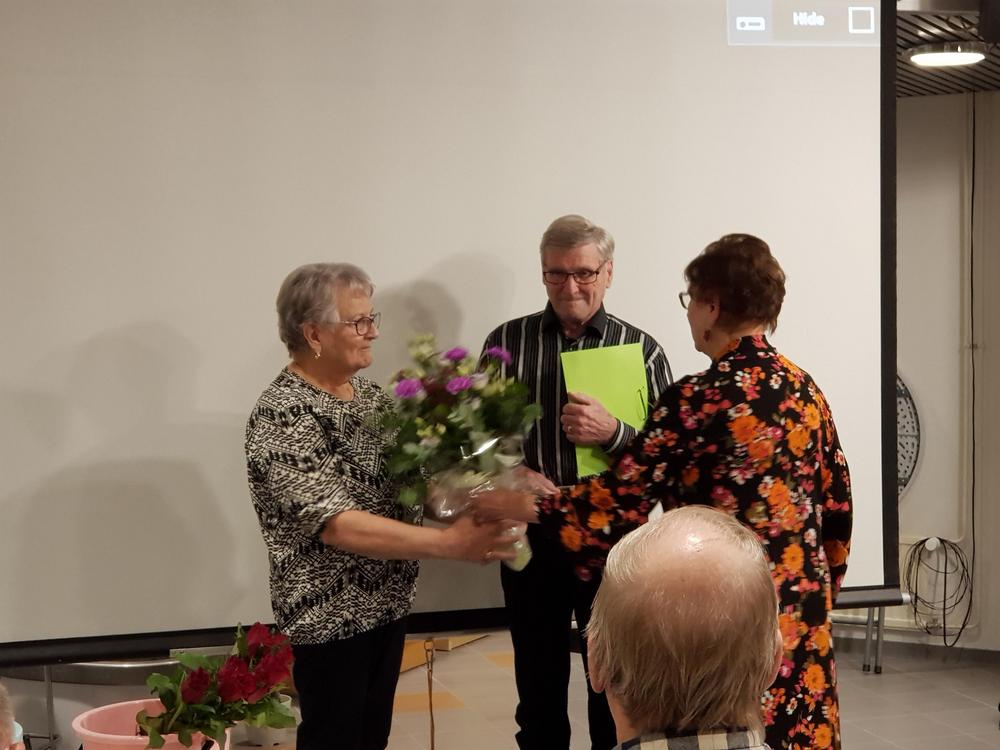 Yhdistyksen puolesta tehdystä työstä annettiin kiitokset, kukat ja omatekoinen kortti, johon kaikki tapahtumaan osallistuneet olivat nimensä kirjoittaneet.