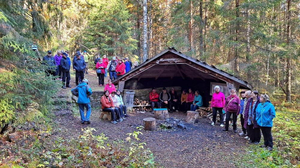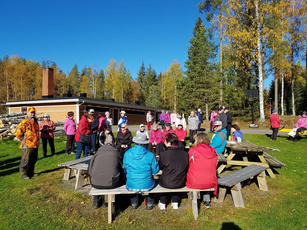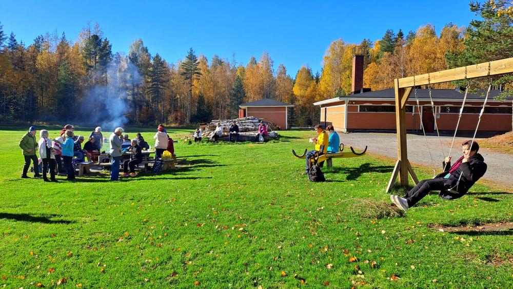 Aurinkoisessa ja lämpimässä syyssäässä matkasi Törmälään viitisenkymmentä jäsentämme. Perillä oli tarjolla monenlaista aktiviteettia: tarkkuusheittoa kävyillä ja kivillä, mölkyn pelaamista, frisbeegolfin harjoittelua, taideteoksen rakentamista sekä tietysti makkaran paistoa ja kahvittelua. Amandan opastuksella tehtiin pieni patikointiretki vanhalle myllylle, jossa kuultiin sen historiasta. Metsän rauhassa oli ihana kuunnella virtaavan veden solinaa!